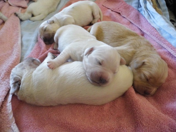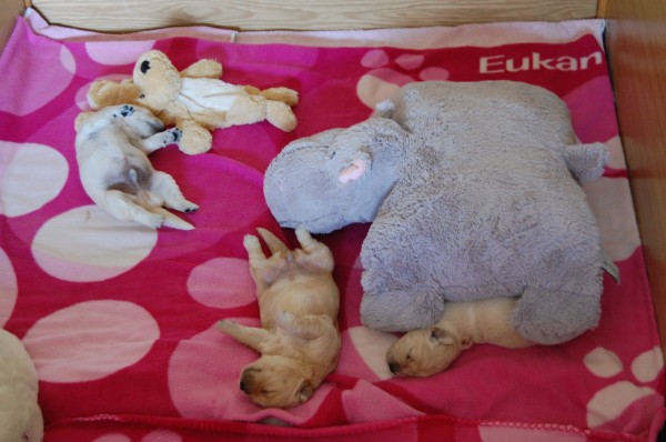 13.06.2015Alle haben sie ihre Augen geöffnet, sie sehen soooooo süß aus mit den geöffneten Augen. Sie entwickeln sich prächtig, Rüde schwarz hat sogar schon sein Gewicht verdreifacht!!!!!! Sie nehmen alle gut zu, Charleen ihre Milchbar ist gut gefüllt. Sie halten schon 2. Stunden aus ohne Milchbar, wenn sie dann aber wieder eröffnet ist, geht es um die beste gefüllte Zitze zu erhalten. Also wie im Urlaub wenn das Büffet eröffnet wird, grins. Das Robben wird nun versucht umzusetzen auf allen vieren zu laufen, was noch nicht so ganz klappt, sie taumeln dann rum und fallen um auf den rücken wie Maikäfer, nur niedlich das zu beobachten, Stunden lang machen wir das. Da bleibt das eine oder andere im Haushalt liegen, egal, das Sixpack ist uns wichtiger!!!!! Töne abgeben können sie auch schon wie richtige Goldis, es hört sich an wie bellen, schnurren und knurren. Noch einmal schlafen, dann kommen die ersten Welpeninteressenten und können das Sixpack hautnah erleben, sie können es alle kaum erwarten, was wir gut verstehen.