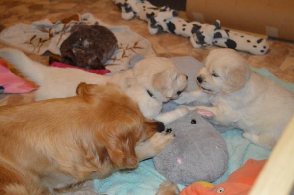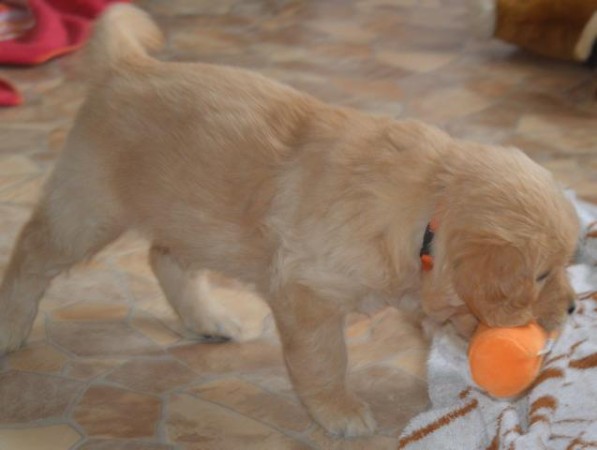Wir planen mit unserer Hundin "Goldis Golden Charleen" bei der nächsten Läufigkeit unseren F-Wurf. Sie ist aus unserer eigenen Zucht und wurde am 31.05.2009 von ihrer Mama Cimberly to the best of one`s belief geboren.Charleen ist für uns eine verschmuste, temperamentvolle, sanfte kleine Dame. Sie ist durch nichts aus der Ruhe zu bringen und immer freundlich , sie hat viel "will to please" und sie ist sehr leicht zu führen, sie liebt Kinder über alles. Sie ist eine wunderbare Hündin die unser Rudel bereichert und mit ihrer Tochter Elinah in unserem Haus lebt. Elinah ist aus dem E-Wurf bei uns geblieben, sie hat sich super gut entwickelt und können uns es ohne die beiden nicht mehr vorstellen.Unsere Welpen werden im Wohnzimmer in einer Wurfkiste geboren und bleiben 8 Wochen bei uns bevor sie in ihre Familien gehen. Wir schlafen diese Zeit im Wohnzimmer über 9 Wochen lang, somit sind wir immer in der Nähe unserer Sonnenscheine und bekommen alles sofort mit. Sie lernen alles kennen, wie die Spülmaschine, den Staubsauger, Tunnels, Stofftiere, Auto fahren, viel Besuch usw. sie sind von uns für das weitere Leben in der Familie sehr gut vorbereitet. Wir sind auch nach der Abgabe immer für sie weiter Ansprechpartner und machen Regelmäßig Wurftreffen, wo wir dann alle unsere Sonnenscheine wiedersehen, das ist uns sehr wichtig, das der Kontakt bleibt.E-Wurf Geboren am 22.02.2013 hier sind ein paar Eindrücke wie sie bei uns aufwachsen, weitere Eindrücke bei E-Wurftagebuch